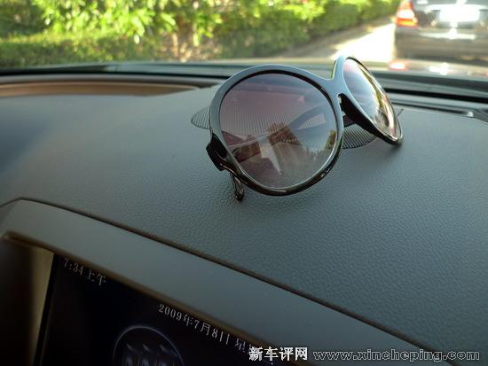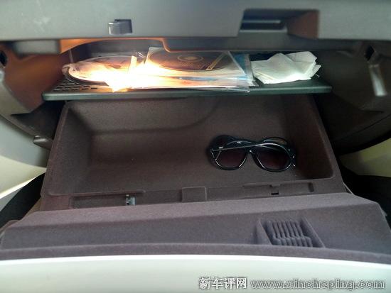 我们之前已经说过储物空间不是新君威的强项,这不,女朋友上车后就发现,自己随身的太阳眼镜无处可放。现在大多数中高级车都会设有一个太阳眼镜盒,这不仅是为了便利,对于驾驶安全也是很有用的,因为大多数驾驶者都会在自己车上常备一个太阳眼镜。新君威没有考虑到这一点,但眼镜还是要放的,找遍全车,就发现手套箱有绒质的软内衬,只要把里面东西清空,专门用来放眼镜了。