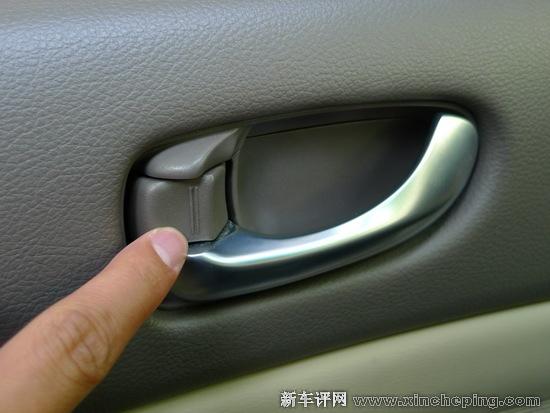 如上图,是天籁是车门内拉手。搬动塑料的小锁梢,就可以改变上锁或解锁状态。这种设于拉手上的锁稍已经被广泛采用,大概80%的新车都是这样的设计。