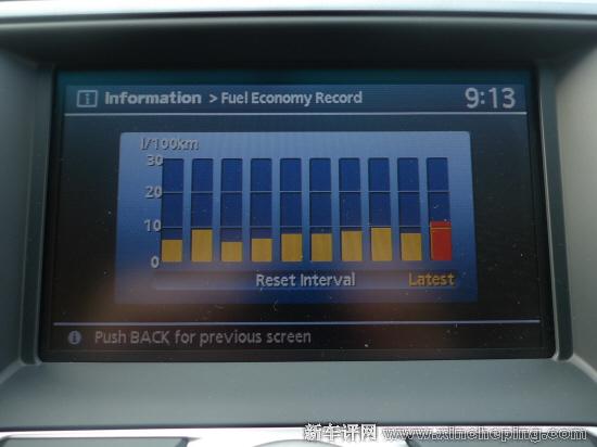 这是一个丰富油耗统计画面。最上端的是剩余油量可行驶里程,往下是平均油耗显示,里头有一“Rsset”选项,可以用来清零平均油耗统计数据,画面的右侧是瞬时油耗。最有特色的还要算画面最下方的“Fuel Economy Record”,进入里面可以看到最近10组平均油耗数据(如下图),每次“Reset”清零平均油耗时,行车电脑都会将此时的平均油耗数据自动记录下来,保存在列表里,这个功能在同级里目前没有第二个。