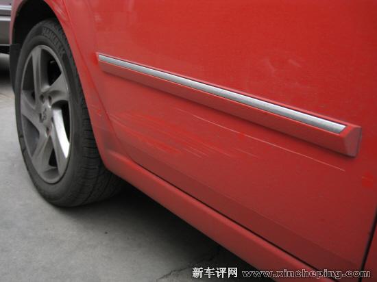 尽管这样,今天开欢动去拿试驾车的时候还是遇到了点小意外,在汽车展场里因为一时粗心,欢动右后门被刮了一下。当时迎面开来一辆中型货车,位置不是很充足,刚好我的右侧是某品牌卖场的入口,入口两边用约30公分栅栏围着,我向右轻轻打了一下方向盘,车子前半部分进去了一点,货车慢慢通过之后,我向左打方向准备回到通道,突然听到轻微的摩擦声——糟糕,肯定被刮了。下车一看,入口处栅栏的边缘向外斜出来——很“阴险”的一个位置。如果之前沿着栅栏直行也会很容易就刮到车辆,何况我还往里稍打了方向呢!遇到这种事只能自认倒霉。看了看刮痕,已经伤了点漆,考虑到单靠抛光已无法修复,于是打电话给保险公司报案。