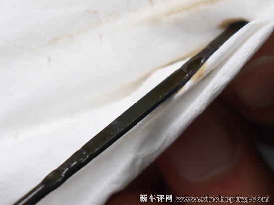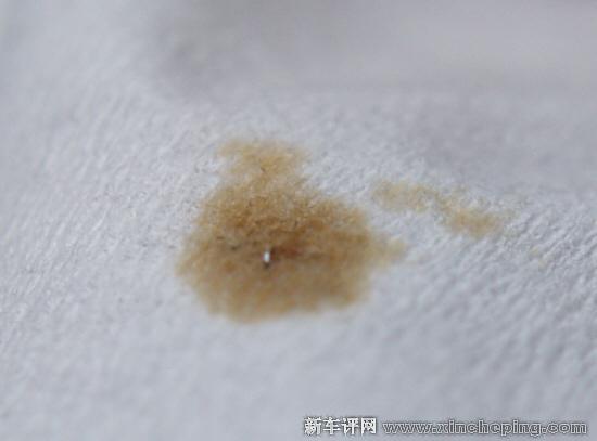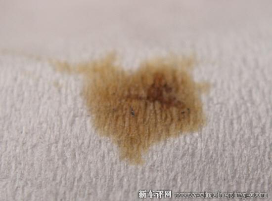三、滤。准备一张干净的纸巾,通过机油尺滴一两滴机油在纸巾表面,机油被洗掉之后如果纸巾表面有金属屑或者杂质,说明应该去保养了。上面的图片清晰看到一些杂质,看来欢动亟需去做保养了。