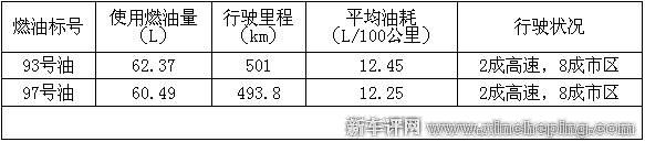 测试的方法是这样的:在油灯亮起后,加满一箱93号油,将行车电脑记录的所有数据清零。在环城快速路上以80km/h左右的速度定速巡航十几公里,行车电脑显示平均油耗为5.8L/100km,将其记录。接下来就和日常用车一样,除了期间跑了150km左右的高速,其余都是市区里用车。油灯亮了去加油,一共加了62.37L,行车电脑记录行驶了501公里,综合百公里油耗为12.45L。