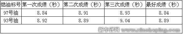 用完这最后一格97号油之后又加进200元93号油,但并没有马上去做测试,为的是避免两种燃油混合在一起,影响93号油的实际表现。将这200元93号汽油消耗到油表剩下最后一格时,再回到同一地点做加速测试。测试条件与97号油相同,得到的成绩分别为8.92秒,8.89秒,9.04秒。
