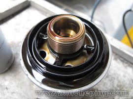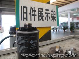 拆下来的机油格被放在一个台架上,这个台架是4S店特意设定用以把旧件展示给车主看的。经过7500km的行驶,换下来的机油粘稠度比新加入的要稀一点,颜色已成褐色,不过仔细看上面并没有明显的小颗粒,估计继续使用至10000km的周期没有问题。