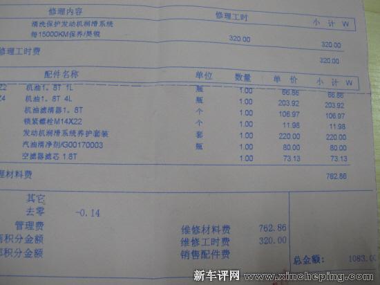 不过冷静分析一下,也别被数字完全遮蔽,因为昊锐的官方规定保养周期为10000km,也就是说下次保养可以在25000km才进行。如果按照里程平摊来算,每5000km花在保养上的费用为431.5元,与日系车的保养费用相当,可以接受。