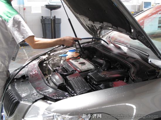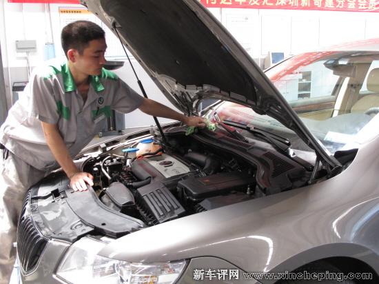 零件更换完毕后,维修人员还将对发动机舱进行了清洗。过程很仔细,先用清洗泡沫在外面喷上一层,然后用水枪进行冲洗(冲洗线路部分时格外小心),最后还用干毛巾擦拭了一遍,像这样的清洗,我们还是第一次碰见,不知其他品牌是否在保养过程中也有此环节,要是没有,斯柯达可真值得表扬。