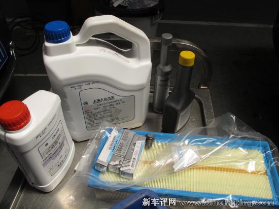 上图:此次保养所需更换的材料:两瓶机油、一瓶燃油添加剂、一套发动机润滑系统清洗剂、四支火花塞和一个空气滤清器。