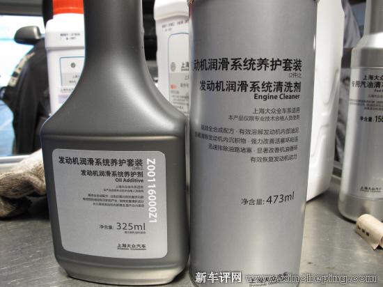 上图:发动机润滑系统清洗套装,右边是保养前倒入,左边是保养后倒入。事后致电上海大众斯柯达400-820-1111热线了解后,这并不是强制要求项目,只是经销店建议添加,若坚持不用,可减少220元的费用。