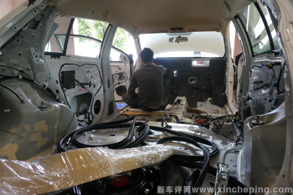 焊焊防滚架之前的步骤,就是对致炫作减重,原装车上的音响、空调、座椅等东西,能拆的都尽量拆下来,甚至连中控台面板也预计用一块铝板代替,车窗全部换成塑料件,车门和发动机盖、尾厢盖都进行切割,把多余的强化结构部分的钢板、防撞钢梁等等都去除。如此彻底的减重是我们去年在科鲁兹上未能实现的。由于我们参加的两项赛事,并没有对最低车重进行限制,而今年我们的赛车马力又比去年的小很多,所以减重方针就是无所不用其极,能到多轻就做到多轻,初步预估,我们有信心将赛车减重到900公斤以内,终极目标是800公斤。