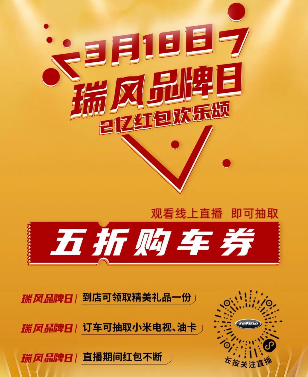 3月18日这一天,一场空前盛大的直播互动不容错过,想买车的你们记得及时上线!那天,瑞风品牌通过微信、快手平台进行线上直播,不仅有源源不断的红包雨,订车有机会抽取油卡、小米电视等超级大奖,更有“天选之子”的至高5折购车券,说不准最终半价购车的王者就是你!