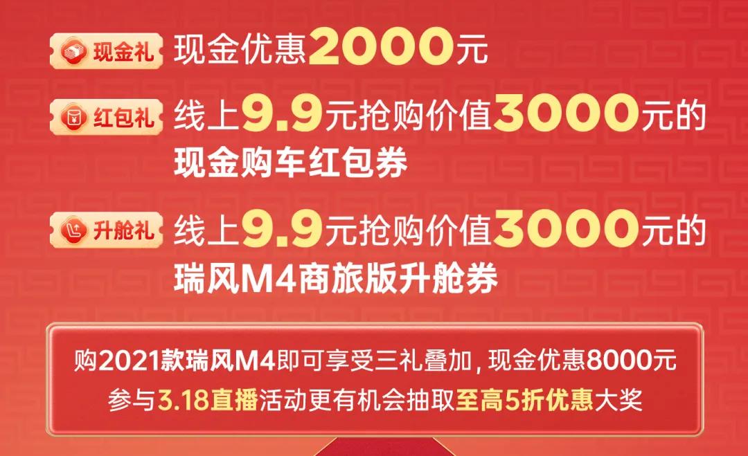 六重礼 升舱礼:瑞风M3宜家版加1000元升级高功率版产品;瑞风M4商旅版加2000元升级为2021款;瑞风L6 MAX加5000元升级为高一版本配置。