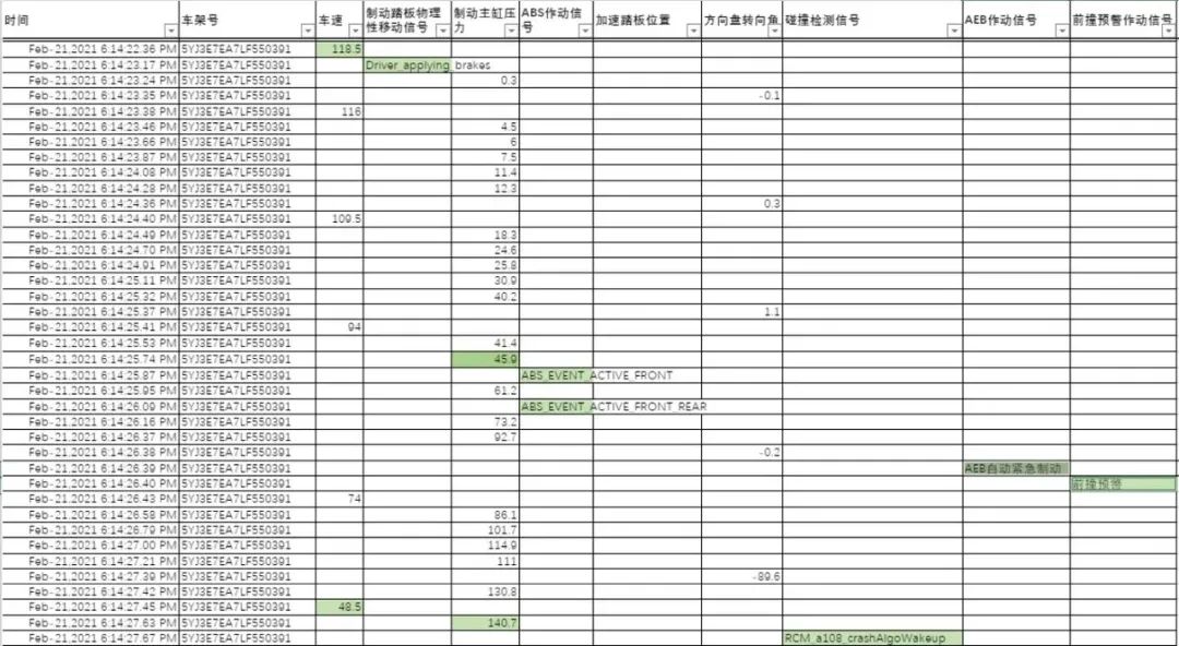 我相信,研读那一份数据成为了许许多多汽车媒体第二天的主要工作。咱们DA的编辑部,几号人,也是研究了大半天。但可惜的是,还是没研究出些什么东西。因为特斯拉在那份数据中隐藏了一个非常关键的因子,那就是表格上“制动踏板物理性移动信号”。