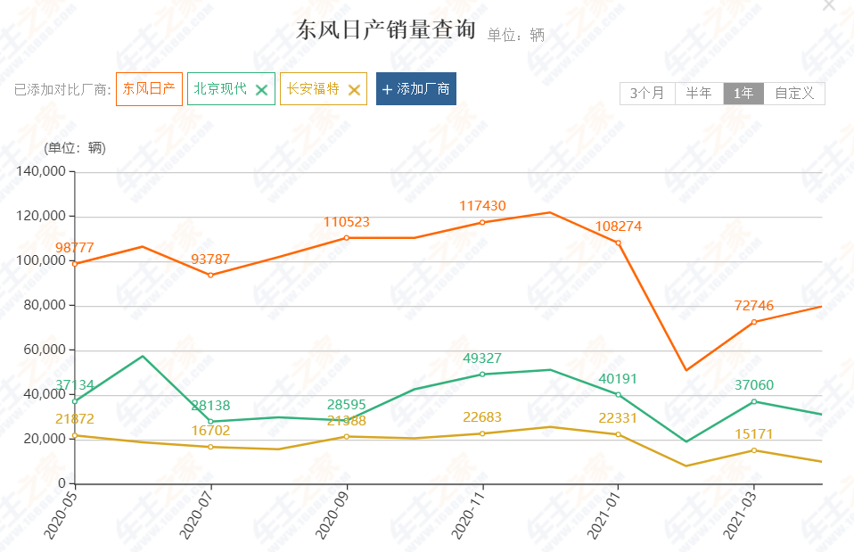 百万阵营中曾经并驾齐驱的三大合资车企东风日产、北京现代、长安福特,现在只有东风日产还守住了位置。
