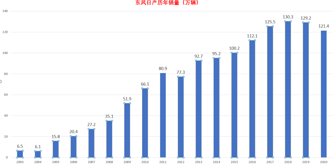2015年,东风日产(含启辰)历史性得突破100万辆大关,此后年销量在120万辆上下徘徊。