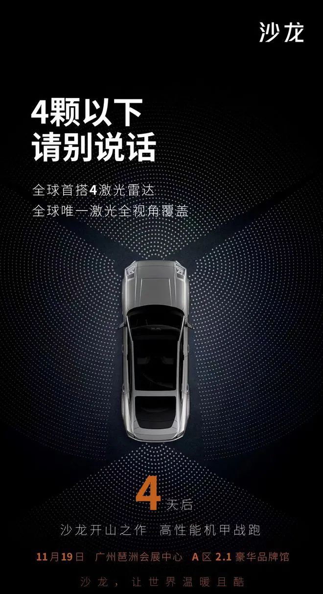 此外,在新车海报上,沙龙汽车还称新车将首搭4颗激光雷达,是全球唯一实现激光全视角覆盖的车型。
