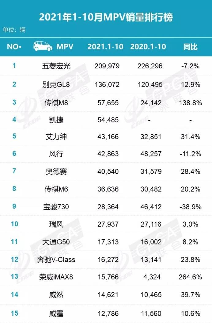 2021年1-10月MPV市场的累计销量排名详见下图: