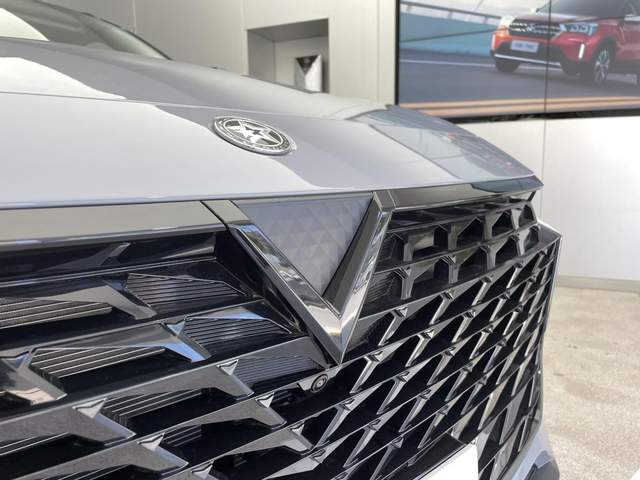LED大灯组跟大尺寸的中网融合在一起,拉伸了横向视觉宽度,同时整个前脸更整齐划一。熏黑格栅的内部线条呈V型排列,仔细看还能看到上面电镀星钻,我在现场认真数过三遍了,不多不少刚好57颗。另外我们还能看到中间设有ACC雷达装置,而下护板应用了仿碳纤维材质,且采用了镂空设计,强化了车头的运动视觉效果。