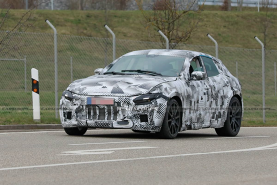 车身后部的造型较为圆润饱满,轮拱和侧裙部位配有黑色护板,跨界风格明显。整个侧面线条轮廓与玛莎拉蒂Lavante有一定相似之处,但底盘高度更低,而且尺寸更为紧凑,看着更像一辆掀背两厢跨界车而非传统SUV。