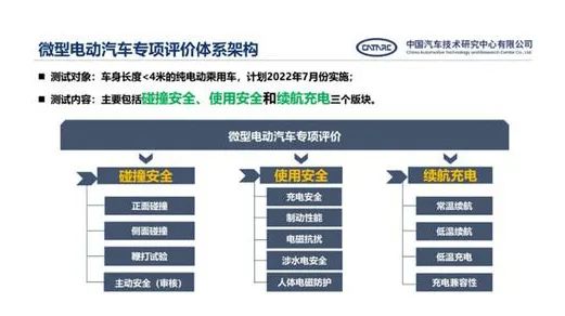 日前,中国汽车技术研究中心有限公司(下称“中汽中心”)正式发布《微型电动汽车专项评价规程》,“该规程适用于车身长度小于4米的纯电动乘用汽车,测评内容在原有C-NCAP和CCRT测评项目的基础上进行适度凝练和简化,主要包括碰撞安全、使用安全和续航充电三个版块。”计划实施时间为2022年7月起。