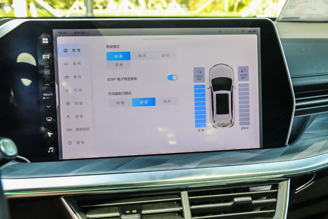 除了动力感受上的改观,神兽 DHT的转向也变得更加柔顺和高级,不光是方向盘的皮料摸上去更加舒服,更是阻尼反馈上的轻松连贯。难能可贵的是,神兽 DHT还支持三种方向盘助力模式,不过亲测感觉差异不大,平时放到“舒适”即可。