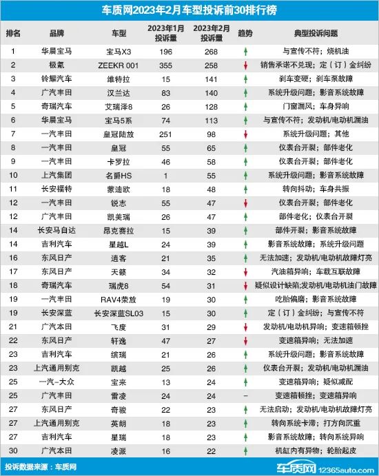 数据显示,本月车质网受理的有效投诉信息共涉及716款车型,其中投诉达两位数(含)以上的车型114款。此外,车质网本月共接到车企针对投诉的回复9,514条(含部分之前月份投诉的回复)。在去除投诉人因为车企解决得当而自愿申请撤诉的信息后,2023年2月投诉量前30的车系(车型)排名如下: