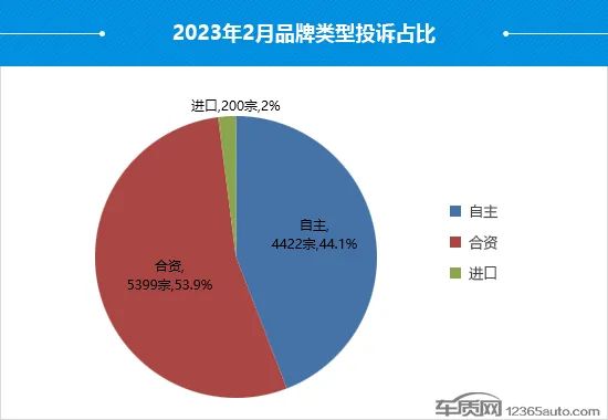 2月份,自主、合资和进口品牌的投诉量环比均出现一定增长,其中自主品牌涨幅最大,较1月份上涨39.9%,投诉占比提高2.3个百分点。反观合资品牌,投诉占比虽然依旧超过半数,但较1月份下降了1.9个百分点。