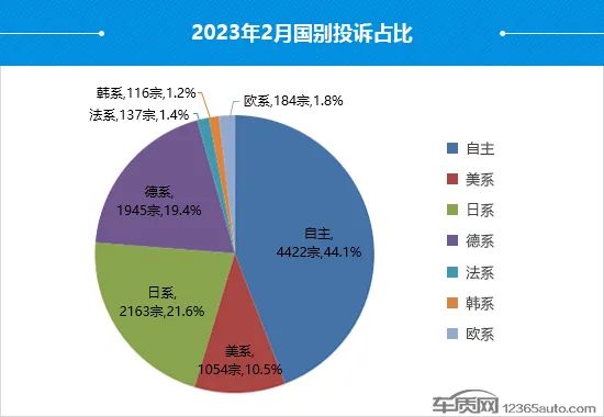 2月,各国别品牌的投诉量环比均有所上涨,其中日系品牌投诉量突破2,000宗,投诉量和投诉占比均达到了近一年来的最高点。德系品牌本月投诉量也出现明显提升,但投诉占比略有下降。