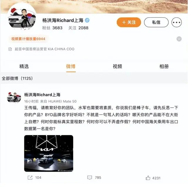 比如,此前上任不久的杨洪海在微博上指名道姓地隔空“碰瓷”王传福,怒斥比亚迪产品存在自燃、虚标续航里程、弄虚作假等问题,甚至表示“BYD这个品牌名字就是骂人的话”。