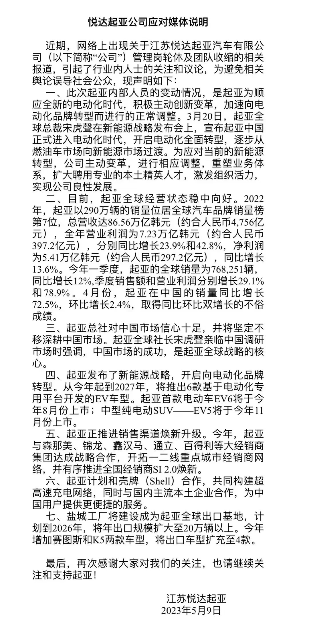 不过,起亚换了一个说法,叫——开启全面改革的信号。