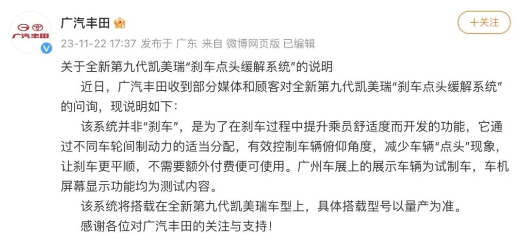 广州车展上有媒体拍摄到广汽丰田第九代凯美瑞的刹车点头缓解系统需要收费,一度将第九代凯美瑞推至风口浪尖。