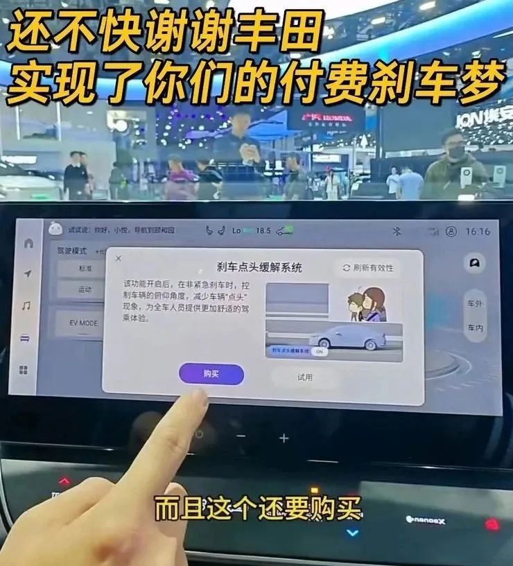 近日,广汽丰田对此进行了回复。官方表示,“该系统并非刹车,而是提升刹车体验的功能,不需要额外付费,车展展车是试制车,车机屏幕显示的是测试内容。”