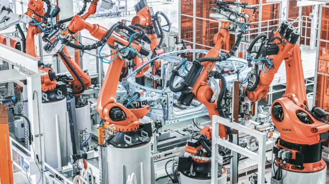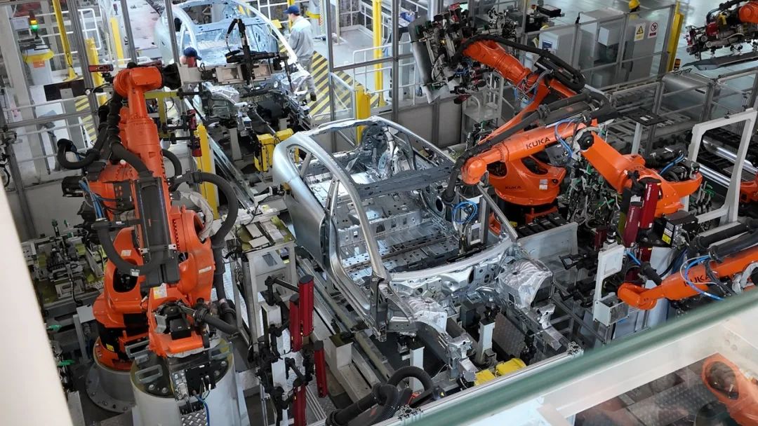 在车身车间里面,实现的工序步骤是车内拼接、车门装配等工艺,整个车间共有756台机器人,可以实现100%连接工艺自动化生产。