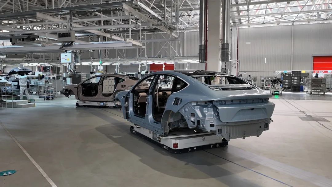 但无可避免的,有部分工序仍需要人工的参与,考虑到蔚来有这么多不同的选装搭配选项,传统的流水线装配已经不适用。所以蔚来在总装车间应用了AGV自动装配岛,来保证自动化机器人和人工装配之间能够顺畅交接。