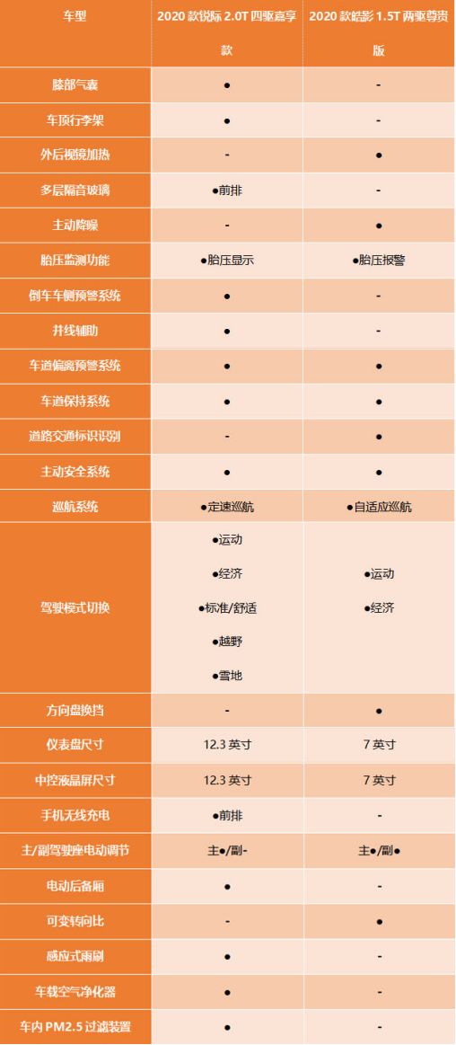 配置方面,两款中配车型在基础配置上都非常齐全,配置取向上,锐际整体更偏向于科技感,而皓影则偏向于舒适感。