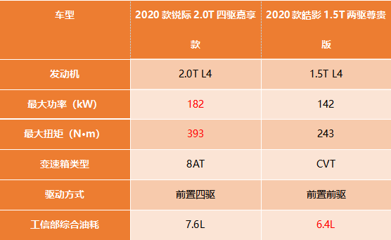 动力方面,从排量上看,锐际的2.0T相比皓影1.5T更具竞争力,传动系统匹配的8AT和适时四驱系统,也是这个价位皓影所不能相比的,但是在燃油经济性方面皓影相对锐际来说会更好。