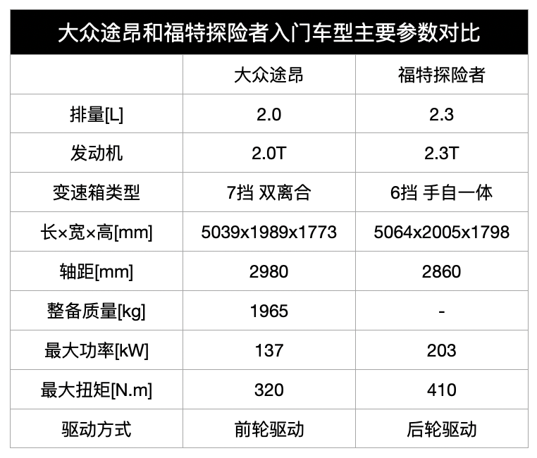除了冒险,探险者还很运动,其入门车型搭载2.3T+10AT动力系统,最大输出来到203kW/410N·m,远超过途昂入门车的2.0T+7DSG动力系统。