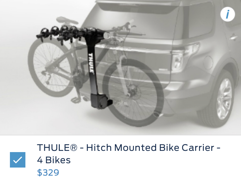可以挂4台自行车的挂架选装价格是329美元,约合人民币2313元。