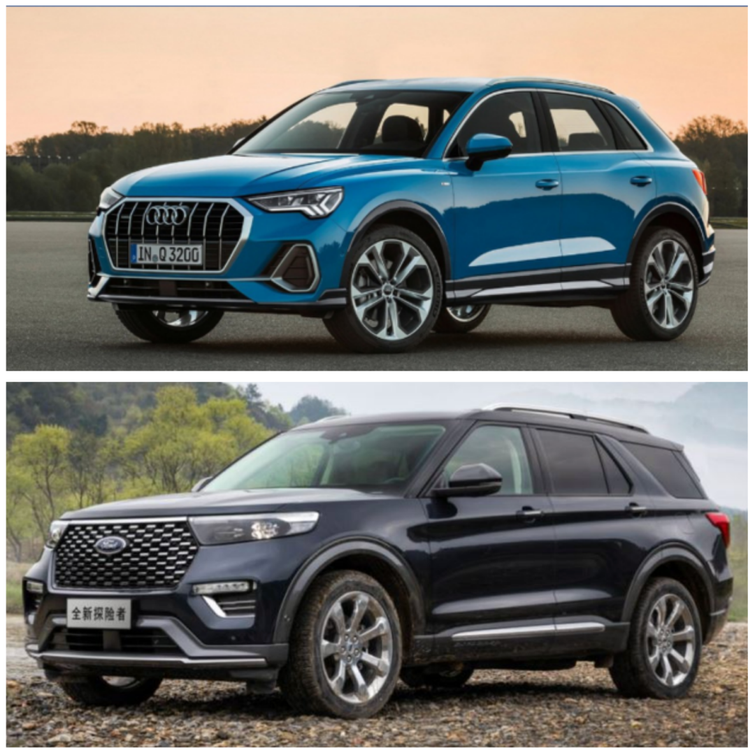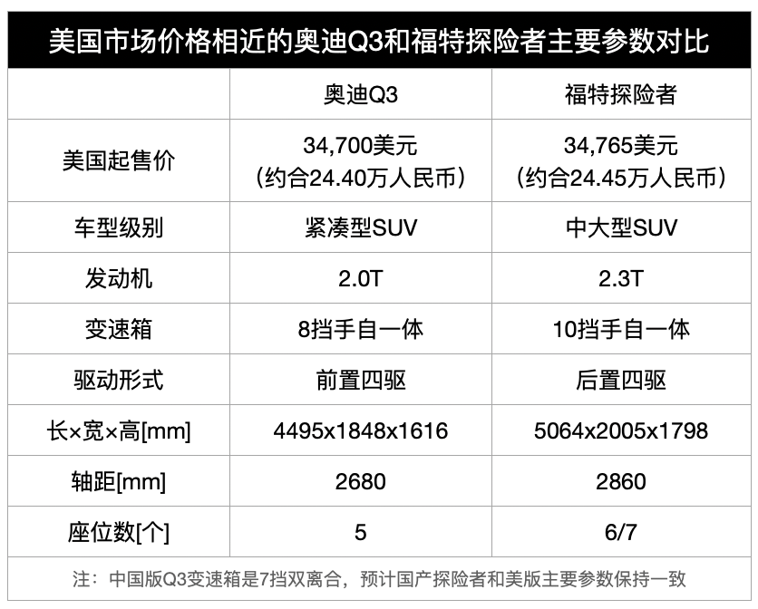 奥迪Q3是紧凑型SUV,可以“紧凑的”坐5个人,福特探险者是比前者大上两个级别的中大型SUV,可以轻松拉7个人。