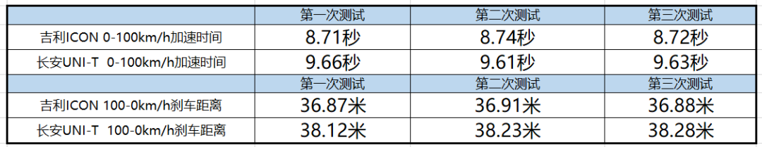 相比之下,长安UNI-T虽然账面参数稍稍领先,但实测百公里加速时间9.6秒,起步速度明显比吉利ICON更慢。100-0km/h制动距离38.12米,稍逊于吉利ICON。