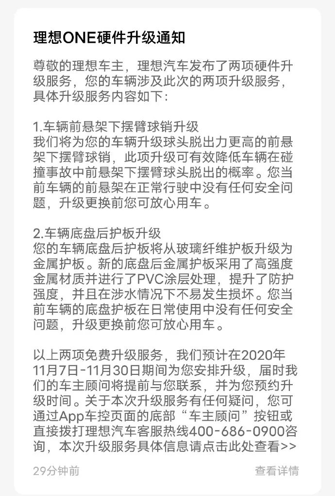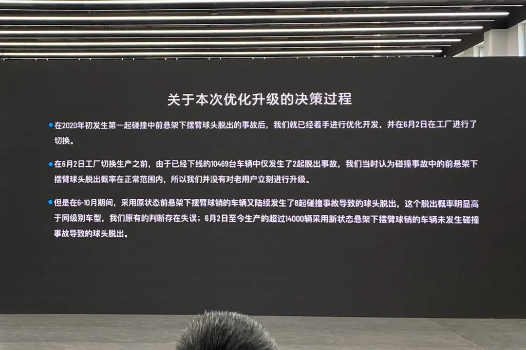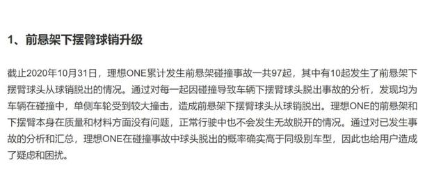 最终的结果,就是理想终于发布了召回通知,宣布为2020年6年1日及之前生产的10469台理想ONE进行召回,免费更换球销脱出力更高的前悬架下摆臂,至此,这件事情应该是完美结束。