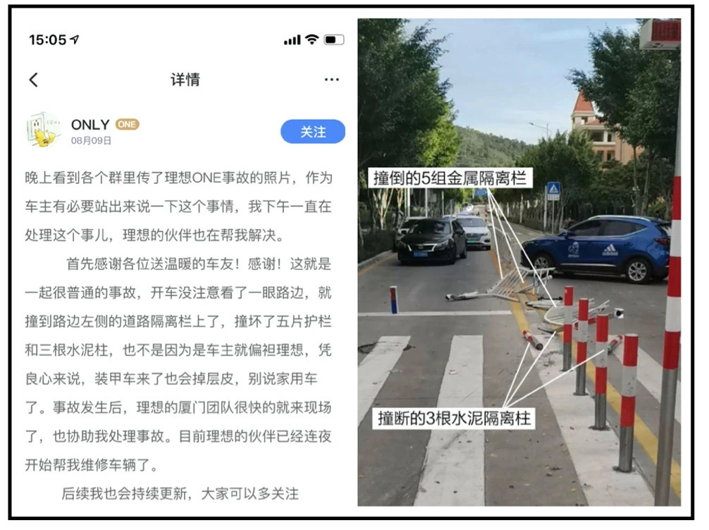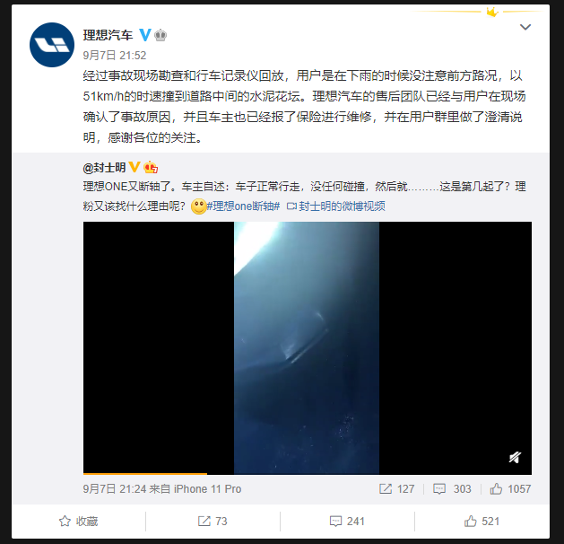 9月7日,一辆理想ONE以51km/h时速撞上了道路中间的花坛,又一次发生了断轴。