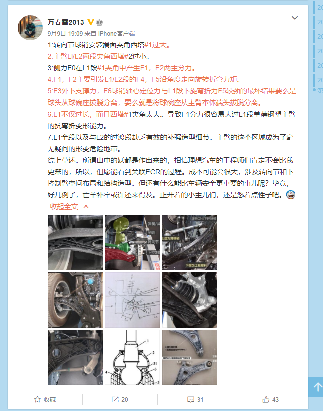 而微博上早有按捺不住的博主分享了理想ONE前悬挂的相关受力信息,并指出相关问题。