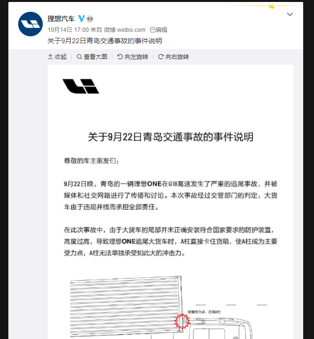 第二个是理想的态度并不足以服众。虽然在每次事故后理想都迅速跟进,有相关的售后人员跟进事故车主,并在微博上通报相关情况,包括4月30日的电子刹车助力消失、5月8日的长沙理想ONE自燃事件以及9月22日的青岛驾驶辅助功能无法识别变道车辆导致追尾的事故当中都有发布相关的声明。