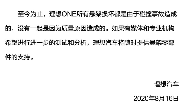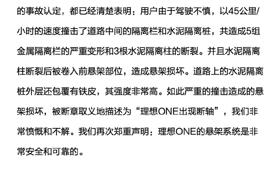 总结一下该声明就是:悬挂没有任何问题,只有驾驶员操作原因导致悬挂受到外力而损坏。诚然,国家相关规则并没有规定碰撞后悬挂不能损坏,也没有规定要悬挂要受到多少外力不损坏。但该声明没有回答的是为什么那么容易脱落呢?。正如5月11日事件车主在微博发布的那样,对理想ONE如此容易就发生悬挂事故无法接受、无法苟同。所以在相关声明当中,理想ONE一直没有直面问题,没有给出人们希望得到的信息。整个声明颇有点转移焦点、避重就轻的意味。