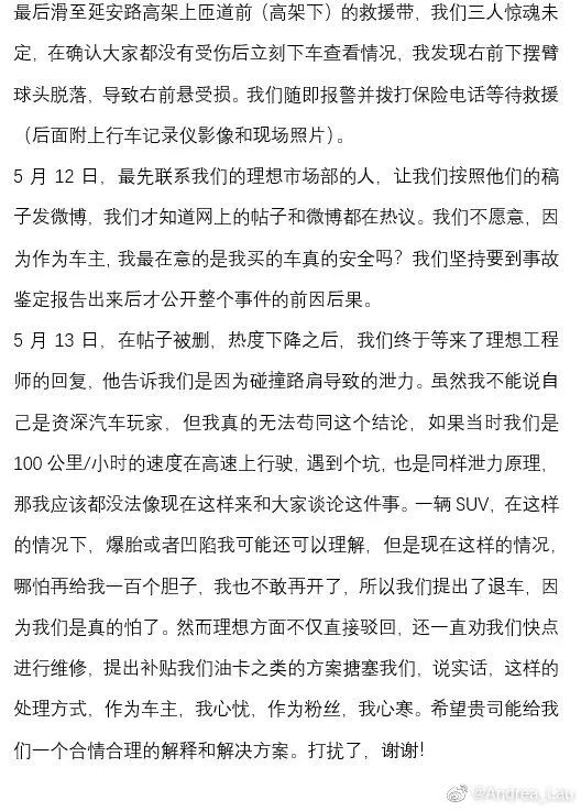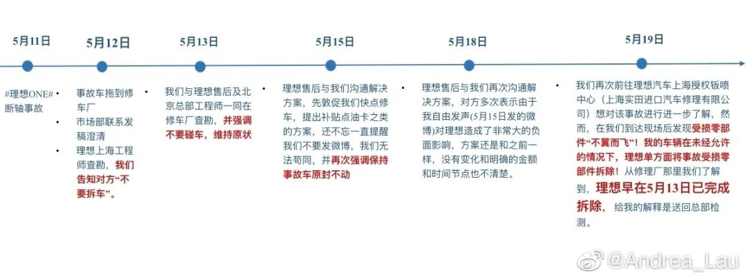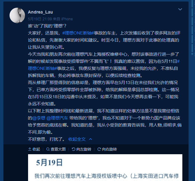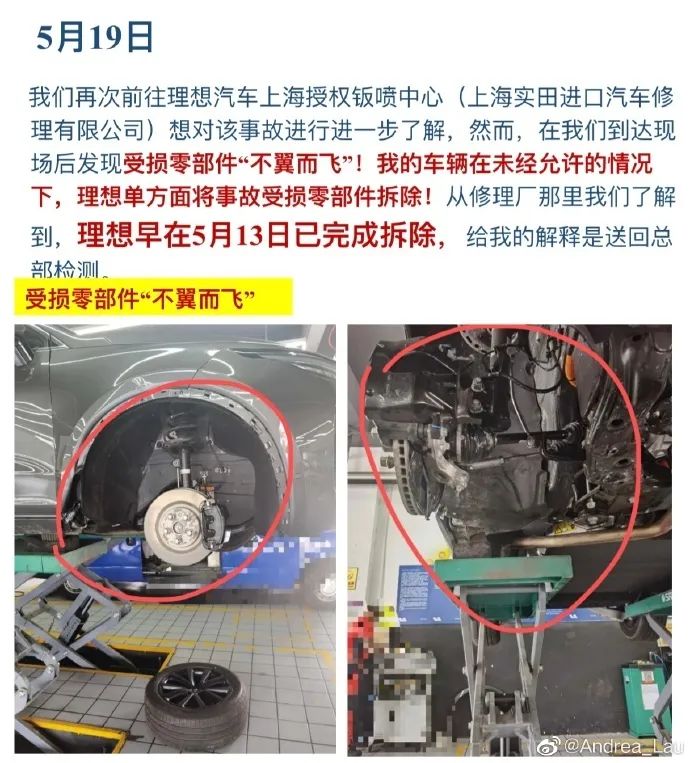 但这件事还没完,5月19日,车主发微博称理想在未得到其授权的情况下,将受损部件私自拆除,这引起了该车主的极度不满。
